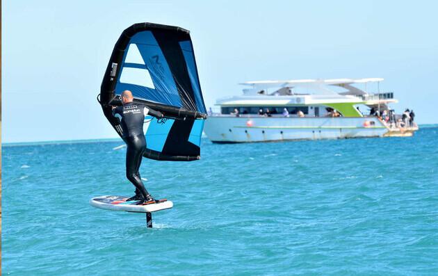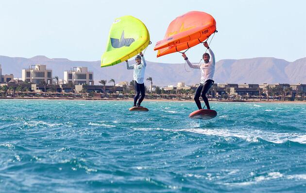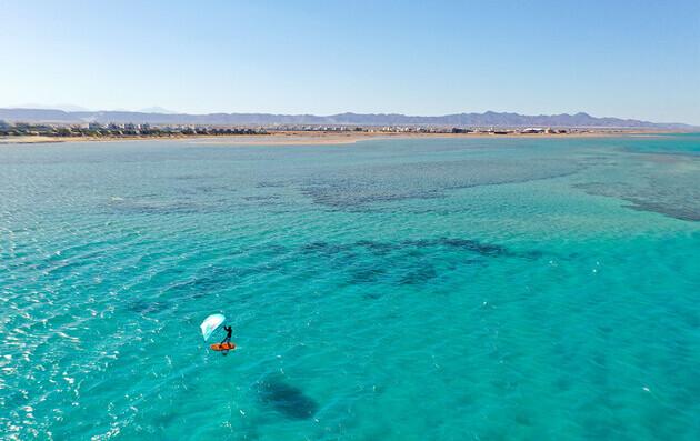Der Spot am Labranda gehört zu den besten und vielseitigsten Wingfoilspots in Ägypten. Direkt vor der Station befindet sich die flache und sandige Lagune, die bei Hochwasser für das Wingsurfen mit Finnen genutzt werden kann. Hier lernen Einsteiger das Winghandling und die ersten Fahrten auf SUP- und Windsurfboards. Hinter der ca. 200 m breiten stehtiefen Zone hat man freien Zugang zum tiefen Wasser und hier kommen völlig tidenunabhängig die Wingfoiler voll auf ihre Kosten. Es gibt weder Korallen noch Riffe oder Steinfelder, die einem den Einstieg erschweren. Diese Spielwiese für Freestyletricks wird nach Norden hin durch ein Riff begrenzt, so dass kaum Wellen entstehen können. Auch Aufsteiger, die die Höhe noch nicht gut halten können, fühlen sich hier wohl, denn sie können die Höhe einfach im Stehbereich wieder "erlaufen". Wer etwas Dünungswelle sucht, der foilt am Riff vorbei und hat weiter draußen die Möglichkeit auf feinste Wellenritte und das in einem riesig großen Freeride Revier mit schönsten Wasserfarben.