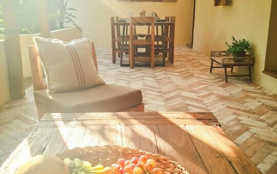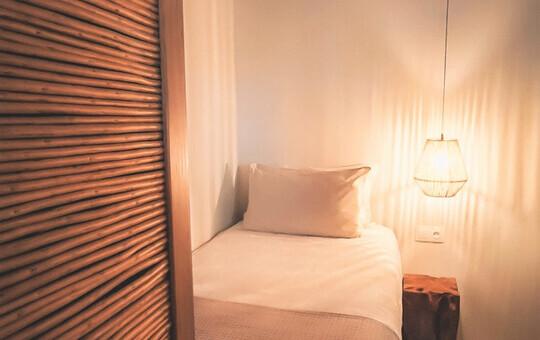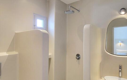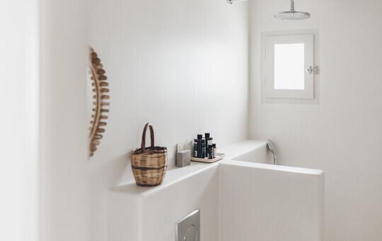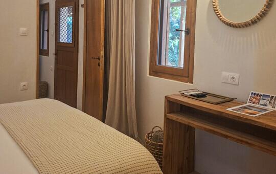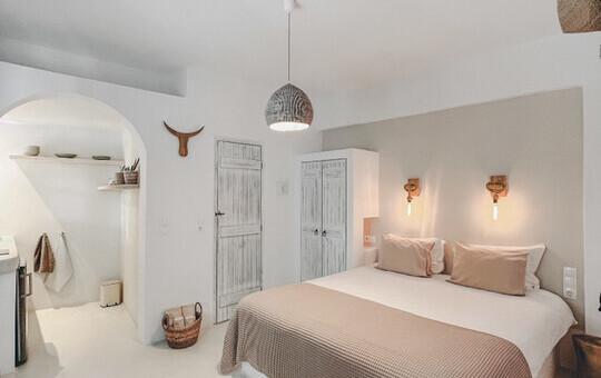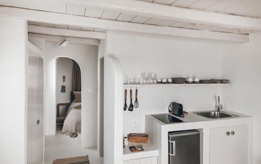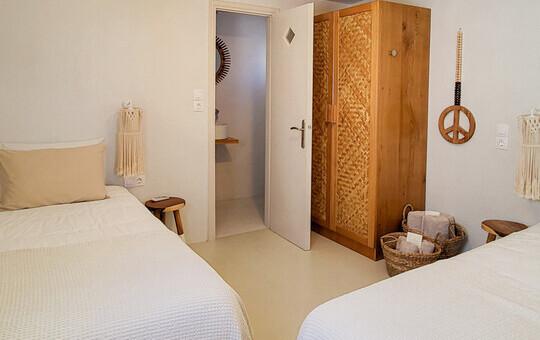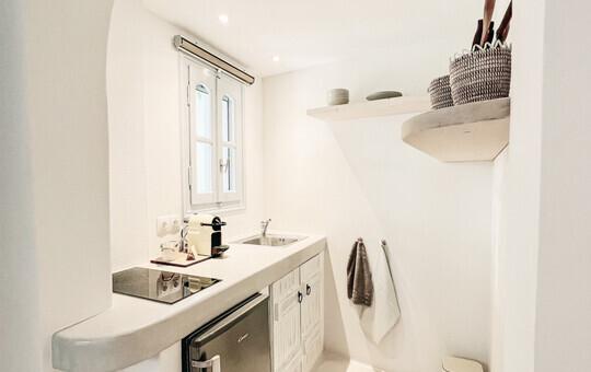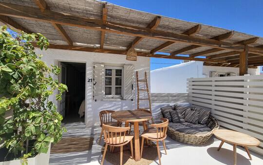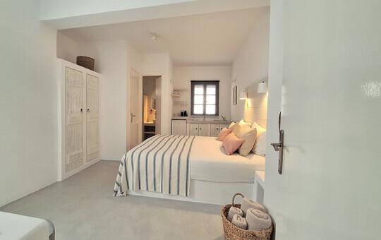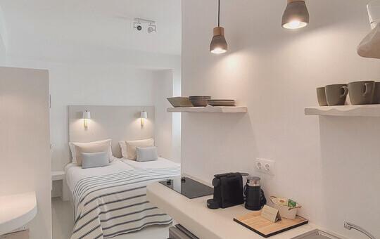Das Notos Appartement ist ausgestattet mit einer Klimaanlage, Flachbildfernseher, Safe und Komfortmatratzen. Das Appartement besteht aus 2 Zimmern, ein Zimmer ist ausgestattet mit einer Kochnische (u.a. mit Nespresso Maschine und Milchschäumer ausgestattet), das andere Zimmer hat einen Kühlschrank und ebenfalls eine Nespresso Maschine und Milchschäumer. Jedes Zimmer hat ein Badezimmer mit Regendusche/WC/Föhn. Das Appartement befindet sich im Erdgeschoss in einem Innenhof mit privater Terrasse vor dem Haus.