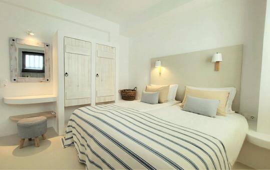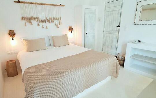 Die Flisvos Breeze Suite liegt im Obergeschoss, oberhalb von einem Restaurant, das während des Betriebs sicherlich zu hören ist. Es besteht aus 2 Räumen, einem Schlafzimmer und einem weiteren Zimmer mit Duschbad. Das Schlafzimmer ist mit einem King Size Bett ausgestattet, das andere Zimmer verfügt über einen Kühlschrank, jedoch keine Kochzeile und hat den direkten Badzugang. Zur weiteren Ausstattung gehören Regendusche/WC/Föhn, Klimaanlage, Safe und Komfortmatratzen. Von der geteilten Terrasse aus (die Terrasse wird vom Nachbarzimmer als Durchgang benutzt) hat man einen seitlichen Meerblick in Richtung der Windsurflagune. Die Suite ist für Familienmitglieder ab 6 Jahren (unter 6 Jahre auf Anfrage) buchbar.