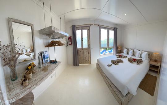 Alle Holzbungalows sind hell und funktionell eingerichtet. Dank der doppelten Holzwände ist es auch im Winter nicht zu kalt. Die Zimmer der Pacha Lodge wirken auf den ersten Blick spartanisch, vermitteln aber dennoch, dank liebevoller Accessoires, eine angenehme und relaxte Atmosphäre. Jeder Bungalow hat eine eigene Terrasse mit Holzsesseln, auf der man entspannen kann. Die mit 25m² sehr geräumigen Zimmer sind mit drei Betten, Kleiderschrank und Badezimmer mit Dusche/WC (Warmwasser) ausgestattet.