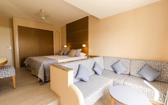 • Doppelbett (verschiebbare Einzelbetten), Sitzecke mit integriertem Schlafsofa (Liegefläche 2,00 x 0,80 m) zur Unterbringung der 3. Person (getrennt vom Schlafbereich durch eine kleine Stufe), Babybett (Anmeldung erforderlich)
