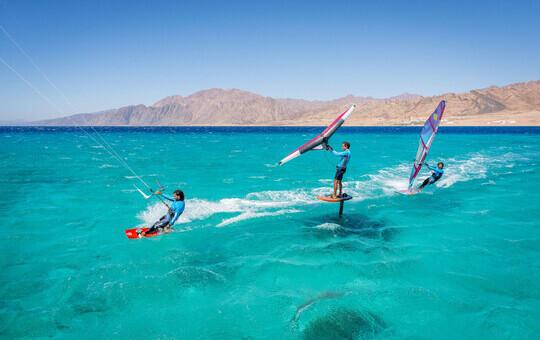 Dahab, die atemberaubend schöne Bergkulisse, das nahe gelegene Örtchen Azzalah, der ganzjährig gute Wind und die Wahlmöglichkeit zwischen "full speed" oder Welle im Kamikaze machen den Spot auf der Sinaihalbinsel zu einem Topspot in Ägypten. Surferisch kommt in Dahab wirklich jeder auf seine Kosten. Anfänger in der Bucht, Wasserstart-Schüler am Nordende der Bucht, "Heizer" im Speedy und Wellenfans im sogenannten Kamikaze. In der Bucht ist der Wind zwar etwas böig, aber sobald man etwas weiter draußen ist, hat man das schnell vergessen und genießt den über der Landzunge nochmals beschleunigten Wind. Etwas vorsichtig muss man im Kamikaze sein, denn dieser Bereich ist von den Stationen aus nicht einsehbar, deswegen sollte man nie alleine rausfahren! An Flautentagen ist auch für Abwechslung gesorgt, denn die Unterwasserwelt lädt zu einem Besuch ein, egal ob nur beim Schnorcheln oder beim Tauchen - es gibt immer etwas zu entdecken. Wem dies als Flautenprogramm nicht ausreicht, der hat die Wahl zwischen verschiedenen Ausflügen: Favoriten sind sicher die Ausflüge zum Mosesberg und in den Coloured Canyon. Mitten in der Nacht geht's los auf den Mosesberg. Der Aufstieg erfolgt im Dunkeln, damit man den Sonnenaufgang am Gipfel erleben kann. Spätestens dann sind alle Mühen vergessen und man kann das spektakuläre Erlebnis genießen. Den Coloured Canyon muss man sich nicht ganz so mühsam verdienen, aber der Anblick ist nicht weniger schön. Die bizarren Felsstrukturen im Sonnenlicht sind wirklich sehenswert! Das Nightlife in Dahab kann nach wie vor sicher nicht mit dem von Hurghada mithalten, aber die nur wenige Kilometer entfernte, mittlerweile moderne Ortschaft Masbat-Azzalah (Taxi ab Windsurfbucht ca. 2 Euro und etwa 7 Fahrminuten) hat einen ganz besonderen Charme. Neben einigen Souvenirläden gibt es Cafés und Restaurants aller Art, sei es thailändisch, chinesisch oder indisch. Außerdem wird frischer Fisch und Lobster sowie Sushi angeboten. Alkohol (Bier und Wein) wird in fast allen Restaurants ausgeschenkt oder zumindest besorgt. Wer nach dem Essen noch nicht gleich in das Hotel zurück will, kann sich in einer der Kneipen noch ein Bier oder einen Cocktail gönnen, um dann in der Disco abzurocken. Die Qualität der Hotels in Dahab ist generell sehr gut. Da ist wirklich für jeden Geschmack etwas dabei, also nichts wie los!