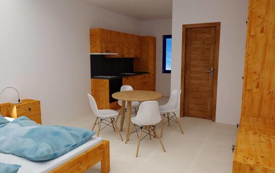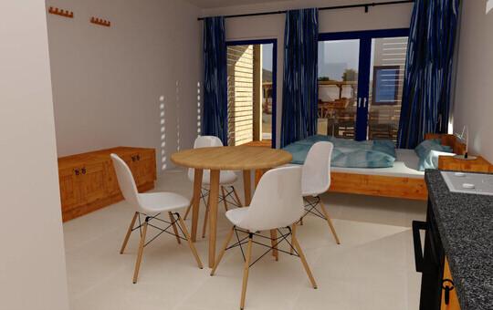 Die Studios sind als Einraumwohnungen konzipiert und für zwei Personen geeignet, mit der Möglichkeit, eine dritte Person unterzubringen. Es stehen entweder zwei Einzelbetten oder ein Doppelbett zur Verfügung; ein zusätzliches Bett kann bei Bedarf ergänzt werden. Zur Ausstattung gehören eine voll ausgestattete Küche, ein eigenes Badezimmer, Klimaanlage sowie eine private Terrasse im Freien.