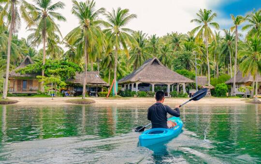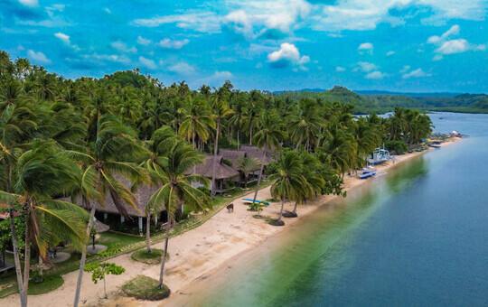 Linienflüge ab mehreren deutschen Flughäfen nach Manila oder Cebu. Inlandsflug von Manila oder Cebu nach Legazpi (Daraga Bicol International Airport) . Transfer vom Flughafen Legazpi knapp zwei Stunden Autofahrt gefolgt von einer knappen Stunde per Boot.