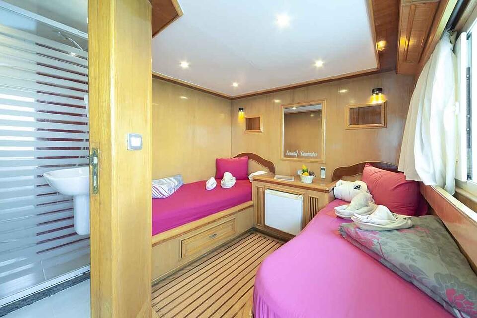 Die vier Doppelkabinen im Oberdeck (3 x mit Doppelbett & 1 x mit Einzelbetten) verfügen über Fenster, Doppelbett bzw. zwei Einzelbetten, eine individuell regelbare Klimaanlage und ein eigenes Bad mit Dusche/WC.