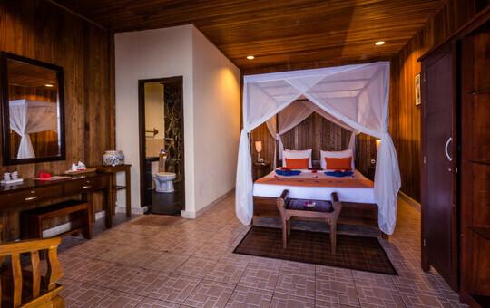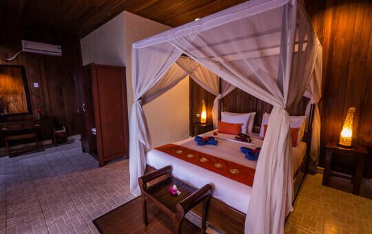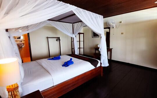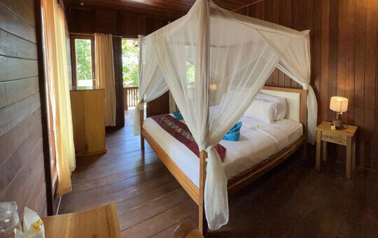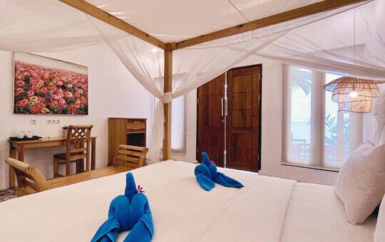 Die fünf Deluxe Beachfront Zimmer sind die neuesten Zimmer und die preislich höchste Zimmerkategorie im Resort. Sie verfügen über eine Klimaanlage und ein modernes Badezimmer sowie einen Balkon mit wunderbarem Blick auf das Meer und den Sonnenaufgang.