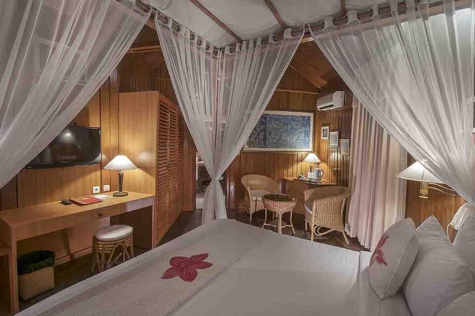 Die sechs großzügigen Deluxe Minahasa Bungalows verfügen über je zwei Zimmer und eine Veranda mit Blick auf den Strand, die benachbarten Inseln und den Sonnenuntergang. Etwas hochwertiger als die die Superior Bungalows ausgestattet bieten die Deluxe Zimmer ein Badezimmer mit Warmwasser, Föhn, Klimaanlage, Deckenventilator, Moskitonetz, Trinkwasser, Safe, Minibar, Kaffee/-Tee Utensilien und Sat-TV (allerdings derzeit nur CNN und indonesische Programme), einen großen Wasserspender sowie bodentiefe Fenster. Zudem stehen den Gästen Strand- und Badetücher, Bademäntel und Taschenlampen zur Verfügung. Zu jedem Zimmer gehören zwei Sonnenliegen und ein zusätzliches Tagesbett auf der Terrasse.