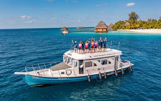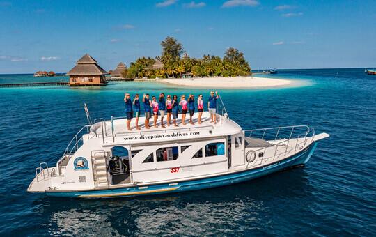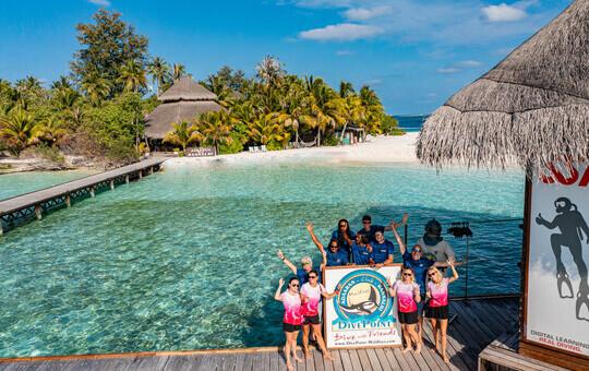 Kleine, familiäre Malediven-Insel mit wunderschönem Sandstrand, geschützter Lagune zum schwimmen und schnorcheln und einer professionellen DivePoint SSI-Tauchbasis unter deutscher Leitung von Marcus Hauck.