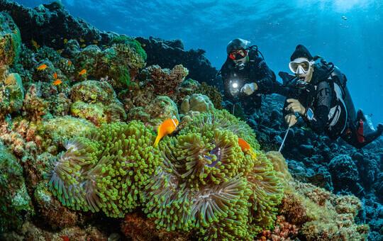 Preiswerte, kleine Malediveninsel ohne Pool mit schönem Hausriff. Top-Tauchplätze (z.B. Kandhoma Thila) können mit dem neuen Fiberglas-Dhoni schnell erreicht werden. Hier wohnt Marcus Hauck, Inhaber von Divepoint selbst.